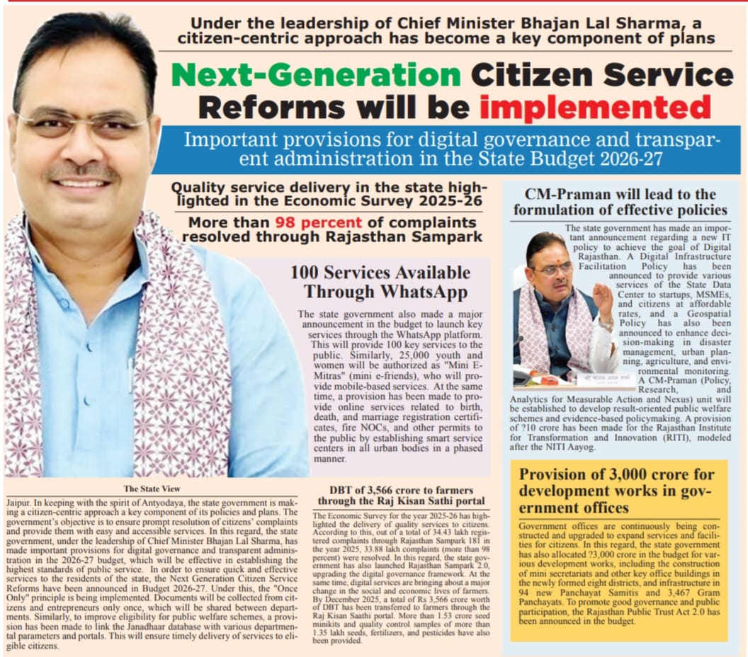 Jaipur. In keeping with the spirit of Antyodaya, the state government is making a citizen-centric approach a key component of its policies and plans. The government’s objective is to ensure prompt resolution of citizens’ complaints and provide them with easy and accessible services. In this regard, the state government, under the leadership of Chief Minister Bhajan Lal Sharma, has made important provisions for digital governance and transparent administration in the 2026-27 budget, which will be effective in establishing the highest standards of public service.