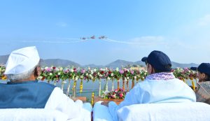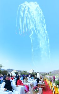 The Sarang helicopter display team displayed a remarkable display of precision and team coordination in the open sky over Jal Mahal.  The team created many shapes in the sky like Sarang Split, Aerohead, Dolphin Leap, Level Cross, High Speed Cross, Cross Over Break, Diamond and Inverted Wine Glass. Surya Kiran Aerobatic Team greeted the people of Jaipur on behalf of the Air Force by creating a heart in the sky along with many shapes like Inverted Run, Barrel Roll, Bomb Burst, DNA Structure. During this, the chanting of “Khamma Ghani” and “Ram-Ram Sa” from the cockpit by both the teams was the center of attraction for the public.